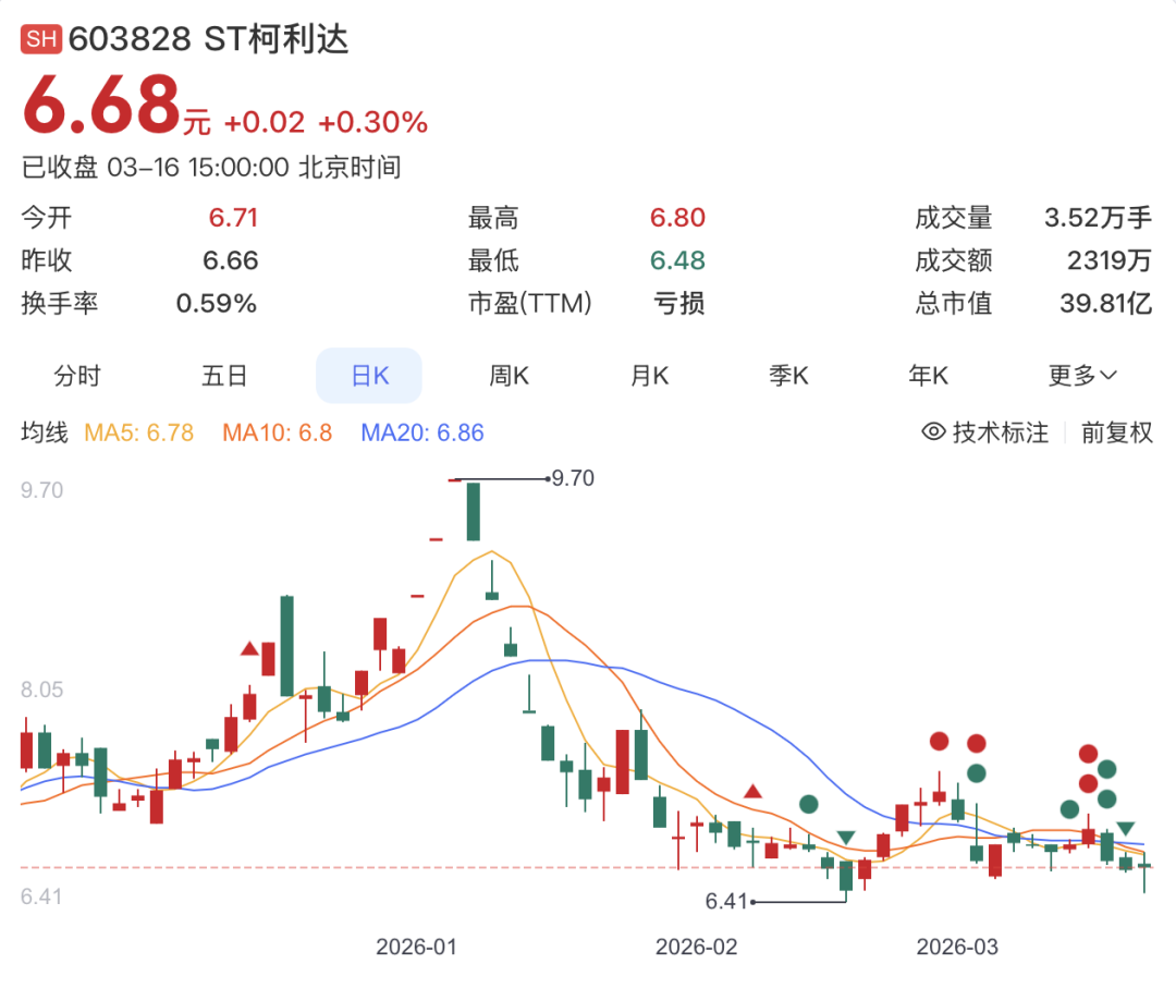截止本日,ST柯利达股价报6.68元/股。